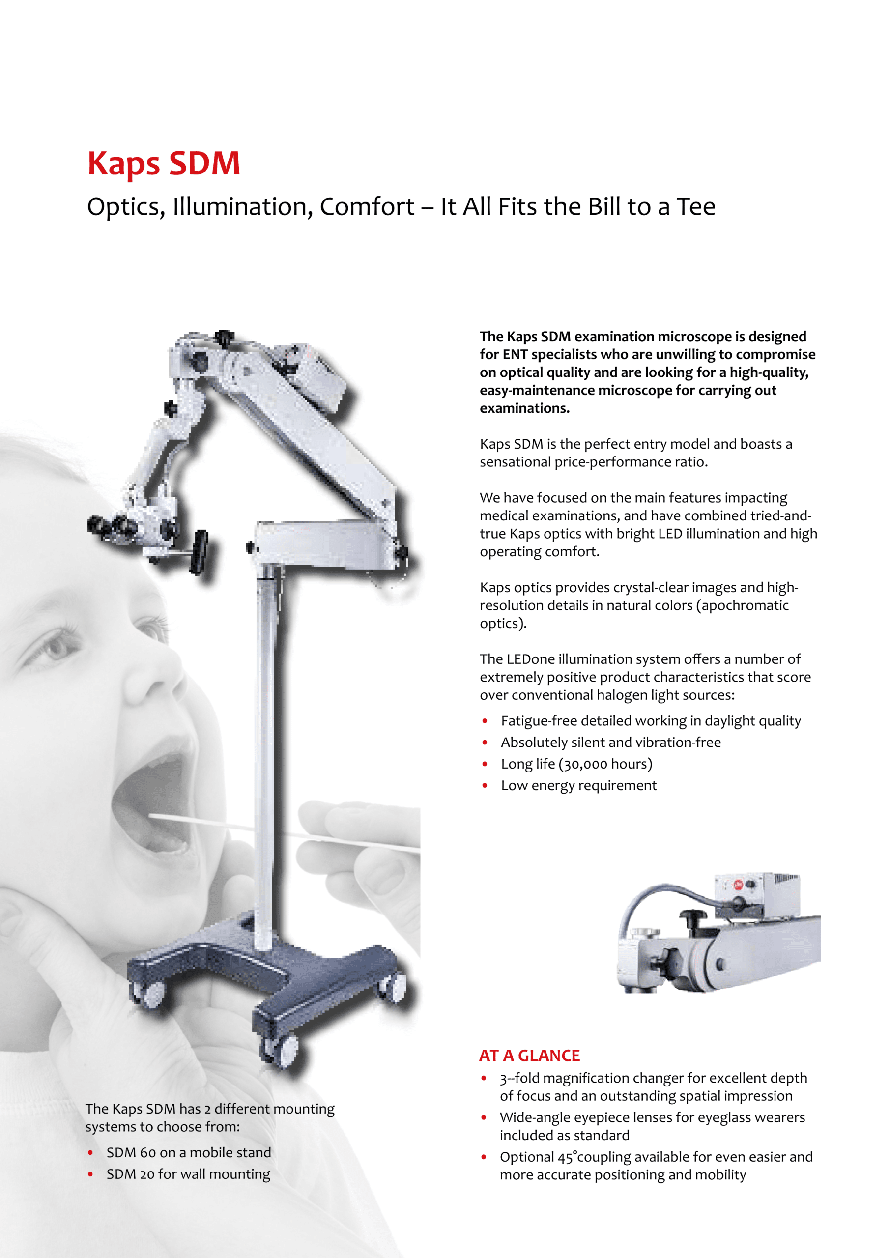 מיקרוסקופ ה־SDM של KAPS נחשב לאחד מהכלים המובילים ברפואת אף־אוזן־גרון, בזכות הדיוק האופטי המרשים והעיצוב הנוח שלו. המיקרוסקופ מצויד בזוג עיניות רחבות, ידיות שליטה ארגונומיות ויכולת כוונון גובה מדויקת המאפשרת לרופאים לבצע בדיקות או טיפולים ללא מאמץ. מבנהו היציב מבטיח פעולה חלקה לאורך זמן בכל סביבה קלינית.